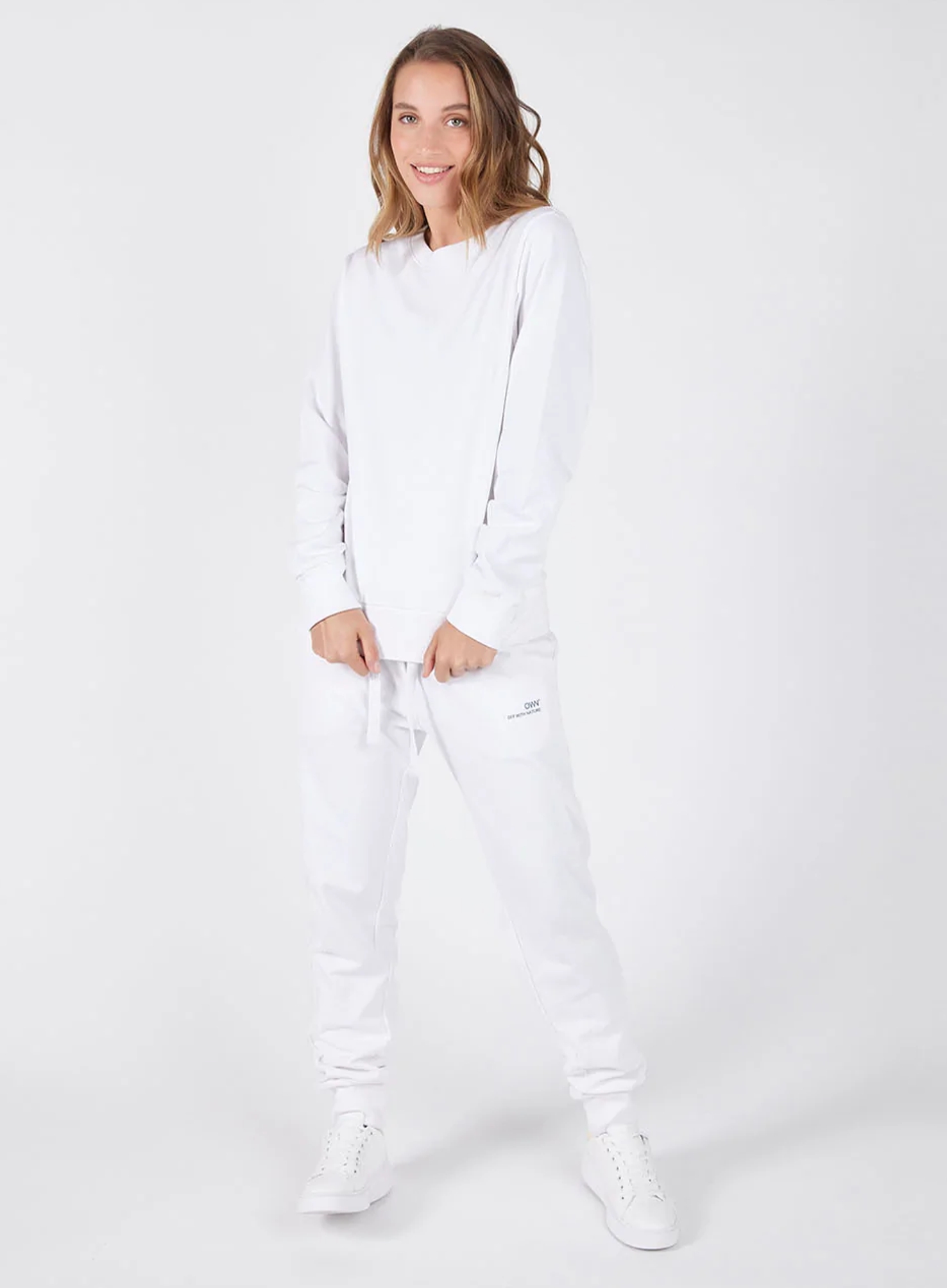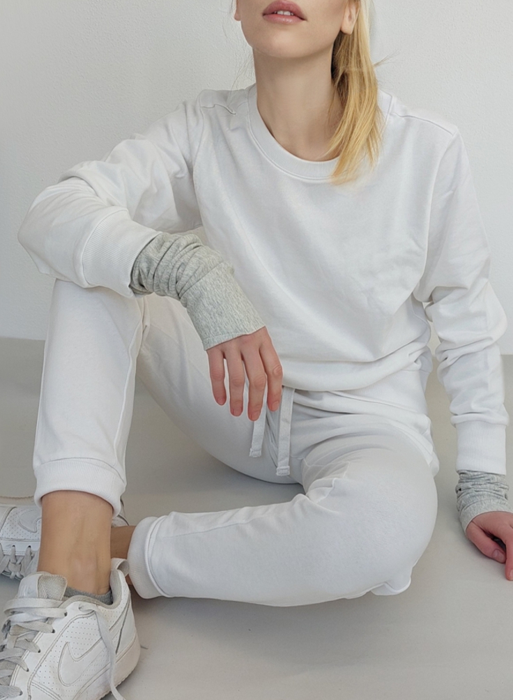 Tuta NON GARZATA adatta alla Primavera, composta da felpa girocollo con collo, fondo e polsini in costina e panta joggers con tasche laterali. Cinturino e polsini in costina. Interamente certificati e realizzati in cotone organico di alta qualità. Il tessuto è resistente e lavabile in lavatrice.